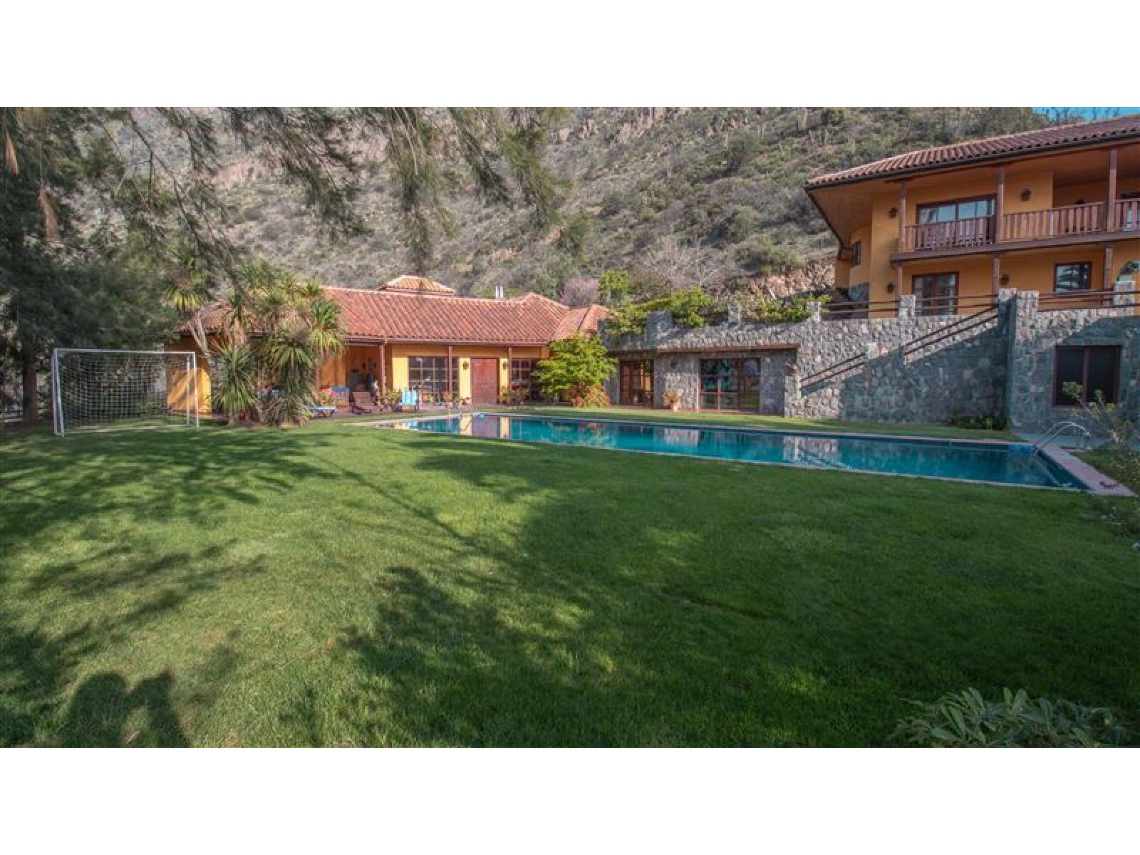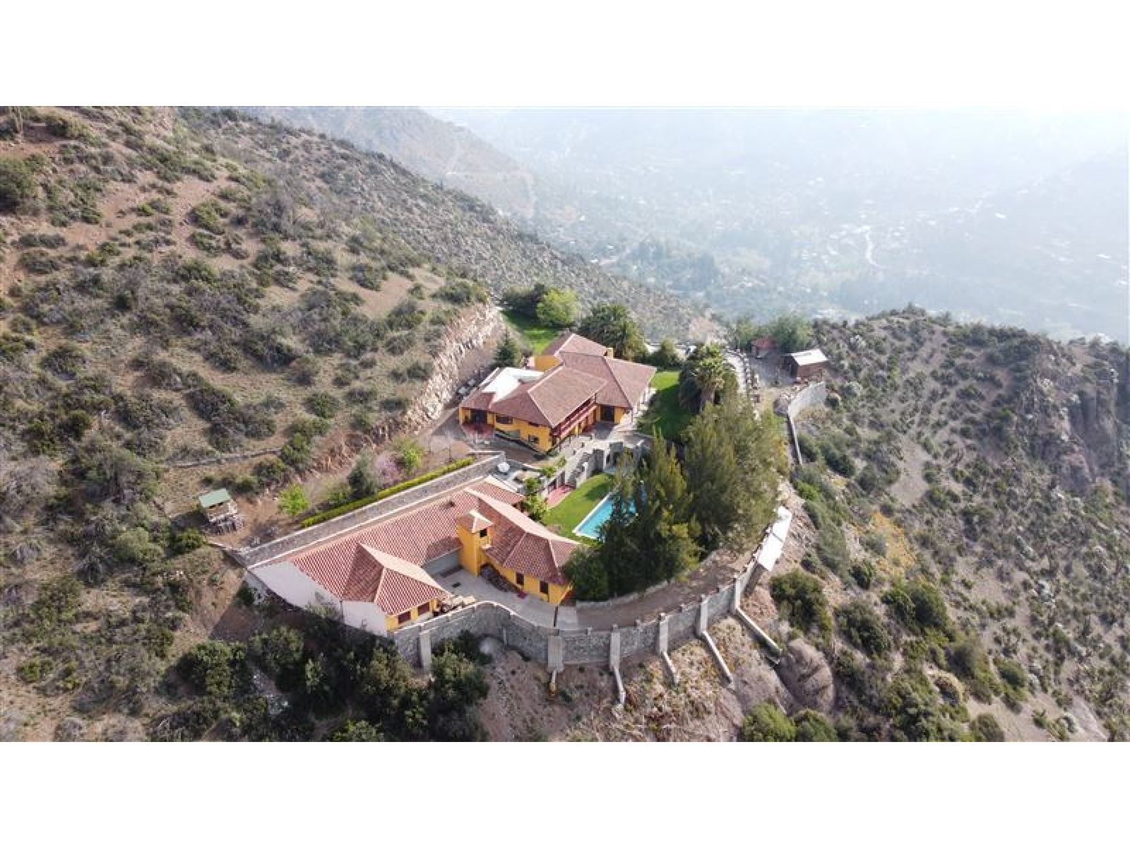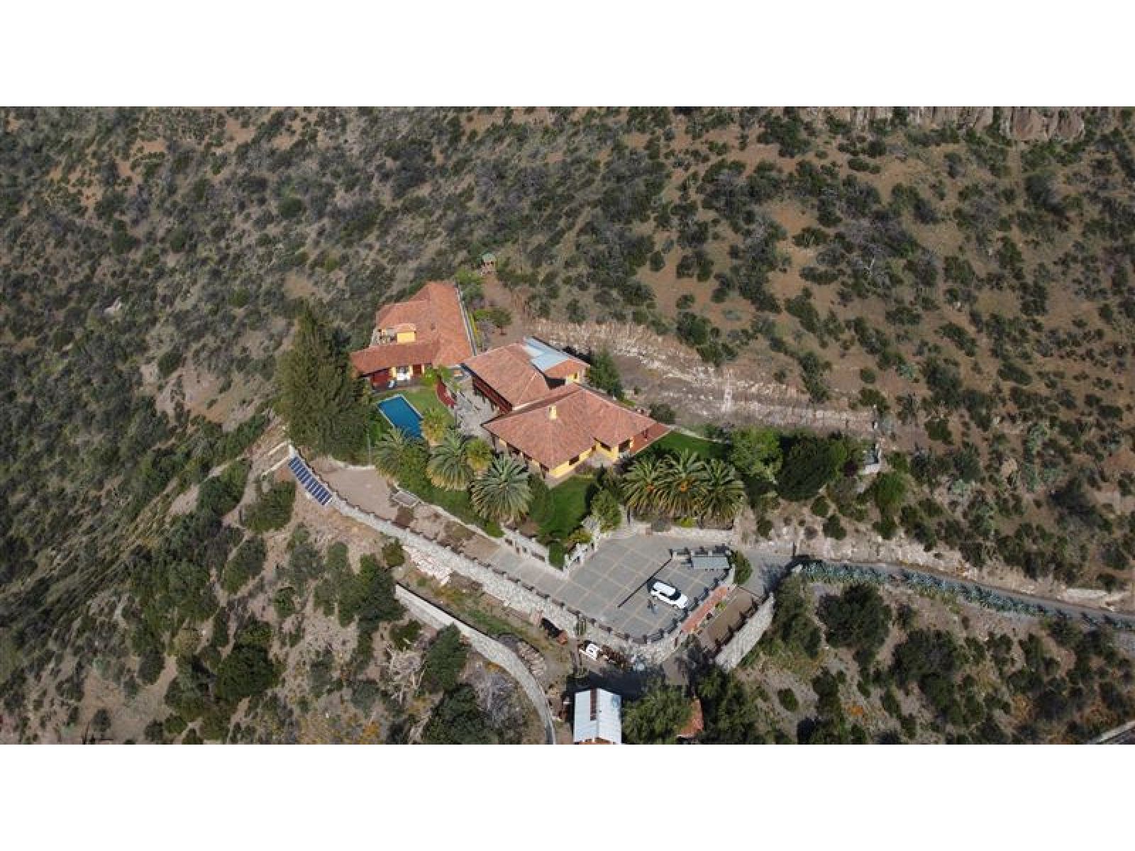 Viva en un entorno natural, en la precordillera de Santiago, disfrutando de las mejores vistas de la ciudad y espectaculares atardeceres en la cordillera de la costa o Cerro Manquehue. A diario podrá contemplar majestuosas águilas y cóndores que vigilan el entorno de la propiedad. La casa es completamente autosustentable; su mantención es económica, y sin duda sera el punto de encuentro de todas sus amistades y familia. Total construido: 1140 m2 Terreno: 44,000 m2, plano aprox 5000 m2 * Casa Principal: Superficie 476m2 Estilo chilena Hall de entrada con chiflonera Comedor Cocina equipada, muebles de Rauli solidos, cocina y horno a gas Gran terraza con hermosa vista a todo Santiago primer piso frente a la cocina Gran Dispensa Living con biblioteca, en total 90 m2, Dos dormitorios en suite primer piso Una oficia primer piso Dormitorio en suite principal segundo piso, baño con Jacuzzi y ducha Sala de estar segundo piso Dormitorio en suite segundo piso Gran terraza con maravillosa vista a la cordillera segundo piso Todas las edificaciones (Casa principal y edificios adicionales ) están hechas solidas de muros de ladrillo fiscal y estucado en ambos lados llegando a un espesor de paredes de 25cm * Pisos en casa Principal: Tablas solidas de coigue con excepción de hall de entrada y baños que tienen pisos de cerámica * Techo: Todos los techos de teja chilena * Ventanas: Todas las ventanas y ventanales, doble vidrio, de madera, Marca European Window * Calefaccion: Hall de entrada: Loza Radiante Dormitorios y resto de la casa: Radiadores Todos los Baños con seca toallas Dos calderas de biomasa, una automática de pellets y chip de madera (con deposito para un año de funcionamiento en forma totalmente automático y estación automatizada de descarga de pellet o chip de madera), un gasifacador de leña, estanques de inercia de 2000 ltr, planta solar de agua caliente de 10 m2 El diseño y la orientación de la casa permite que la casa se mantiene en verano fría pero en invierno temperada por lo cual se usa poca energía para mantenerla cómoda. La calderas de biomasa ademas reducen el costo de calefacción al año a menos 1,500,000 por todo el año. * Energia Eléctrica: La propiedad tiene transformador propio de 27kW, trifásico La energía (media voltaje) AT4.3 tiene un costo mensual es bajo el cuál incluye el costo de bombeo de agua. * Agua: Pozo de 203 mtr de profundidad, capacidad de captación 2.88 m3/hora comprobada, con agua de la mejor calidad ya que no existen viviendas o urbanizaciones aguas arribe, estanque de agua potable de 30m3 * Otras Edificaciones: Departamento Cuidador: 53m2 (dos dormitorios, living / cocina, baño completo) Dormitorio de servicio con baño completo de 17m2 Pieza con Sauna y Ducha SPA colindante a piscina: de 52m2 Edificio hobby: 446 m2 construido con la misma calidad y el mismo estilo que casa principal. Quincho anexo a la piscina 53m2 Estacionamento semi subterrâneo de 66m2 * Piscina: Piscina de 5 * 15 mtr, 2 mtr de profundidad, terminación con azulejos; calefacción con energía solar Sala de bomba / filtros con guardia de herramientas de jardín * Jardines: Jardines consolidadas con atractivas especias, palmeras chilenas de gran tamaño y pasto Todos los jardines riegado con sistema de riego automático En total se construyeron sobre 2000m2 de muros de piedra lo que da un aspecto único integrado al entorno natural. * Camino interior: 600 mtr de largo, 3 mtr de ancho, pavimentado, con muros de retención de piedra en todo su largo Dos portones de entrada solidas, automáticos con control remoto. * Seguridad: La casa se accede por medio de un camino privado de 1200 mtr pasando por un diferencial de altura de 250mtr que es solamente utilizado por una casa mas. No hay peatones ni automovilistas que se pueden acercar a la propiedad sin ser invitados. Para mayor detalle y características de la casa póngase en contacto con nosotros.