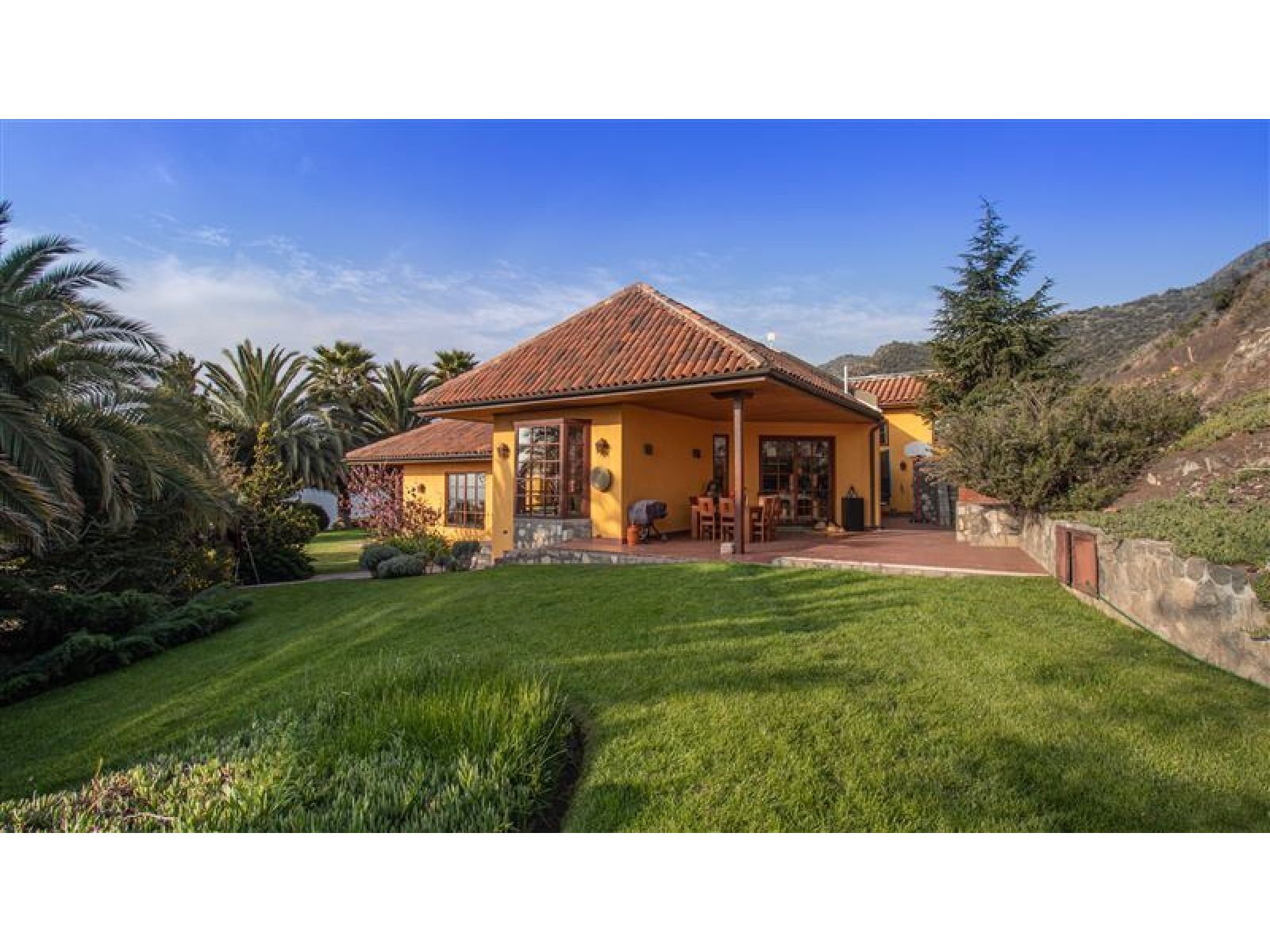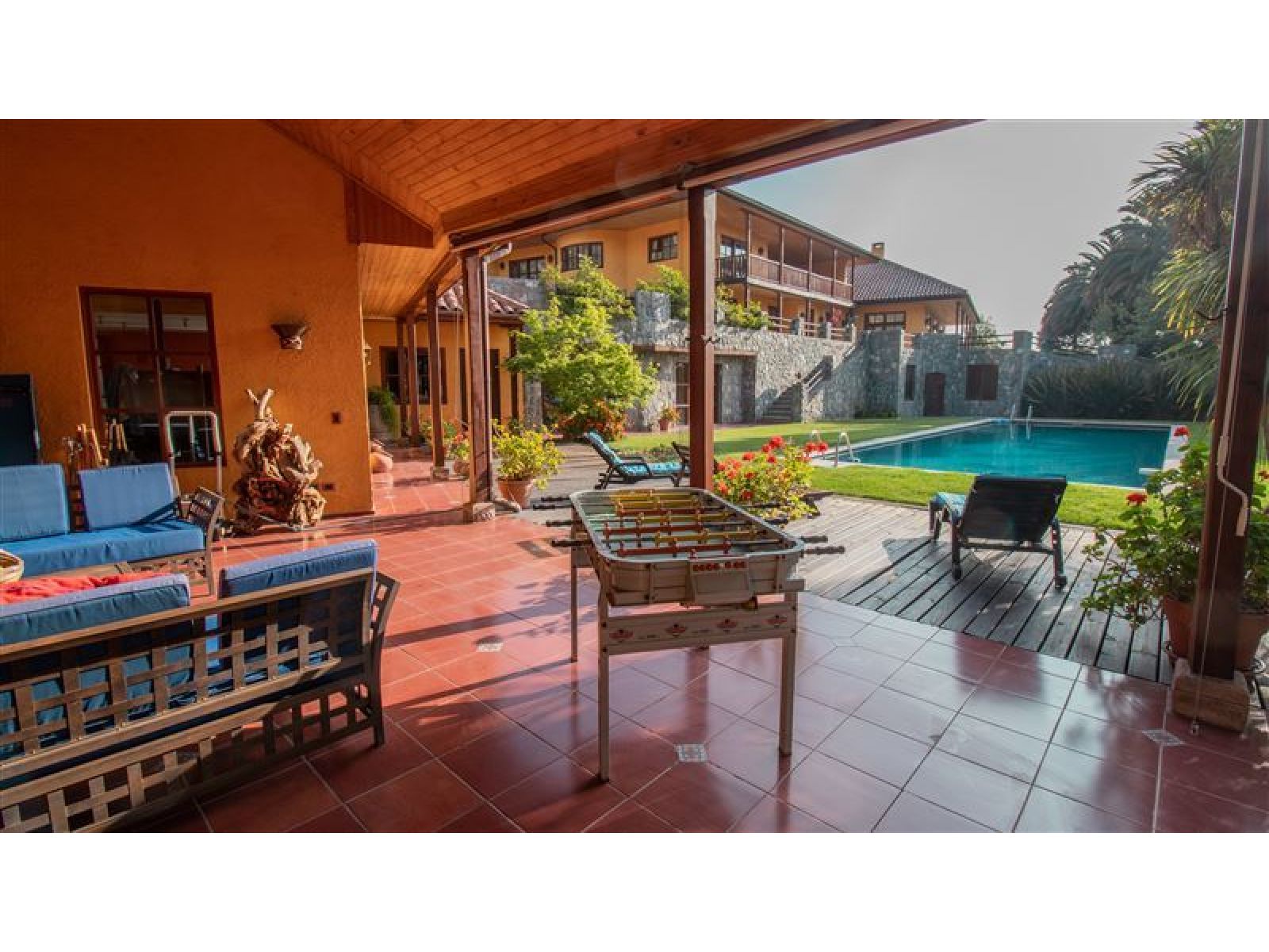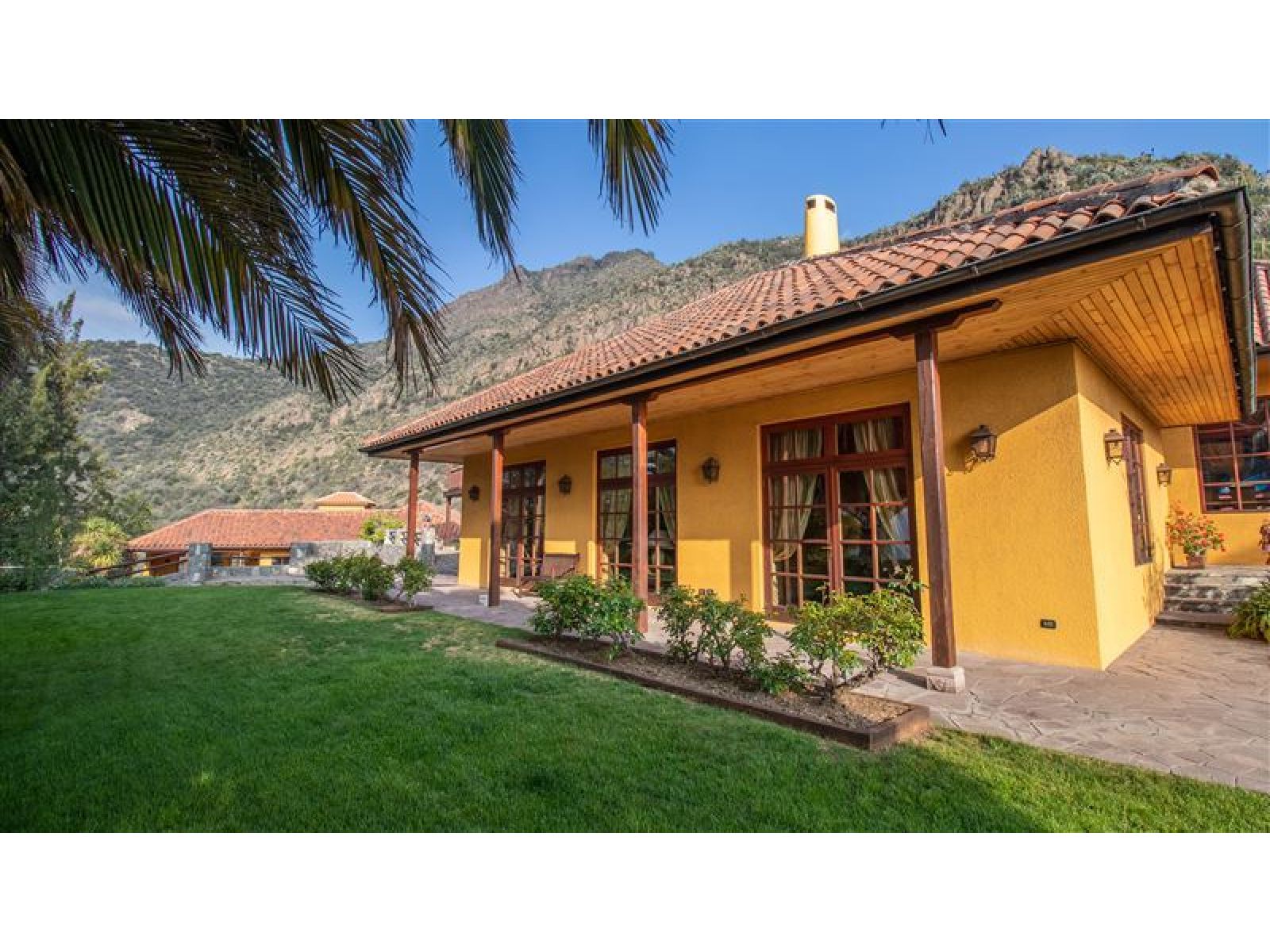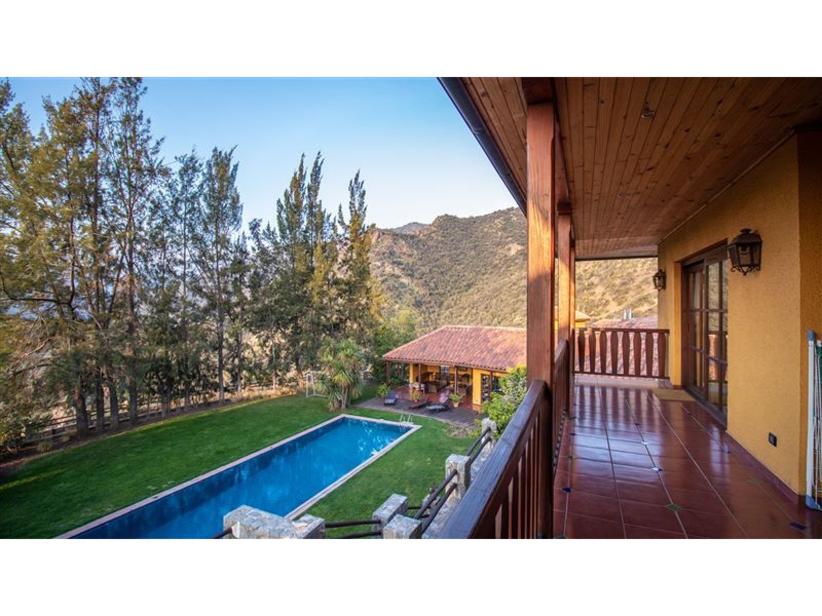 Viva en un entorno natural, en la precordillera de Santiago, disfrutando de las mejores vistas de la ciudad y espectaculares atardeceres en la cordillera de la costa o Cerro Manquehue. A diario podrá contemplar majestuosas águilas y cóndores que vigilan el entorno de la propiedad. La casa es completamente autosustentable; su mantención es económica, y sin duda sera el punto de encuentro de todas sus amistades y familia. Total construido: 1140 m2 Terreno: 44,000 m2, plano aprox 5000 m2 * Casa Principal: Superficie 476m2 Estilo chilena Hall de entrada con chiflonera Comedor Cocina equipada, muebles de Rauli solidos, cocina y horno a gas Gran terraza con hermosa vista a todo Santiago primer piso frente a la cocina Gran Dispensa Living con biblioteca, en total 90 m2, Dos dormitorios en suite primer piso Una oficia primer piso Dormitorio en suite principal segundo piso, baño con Jacuzzi y ducha Sala de estar segundo piso Dormitorio en suite segundo piso Gran terraza con maravillosa vista a la cordillera segundo piso Todas las edificaciones (Casa principal y edificios adicionales ) están hechas solidas de muros de ladrillo fiscal y estucado en ambos lados llegando a un espesor de paredes de 25cm * Pisos en casa Principal: Tablas solidas de coigue con excepción de hall de entrada y baños que tienen pisos de cerámica * Techo: Todos los techos de teja chilena * Ventanas: Todas las ventanas y ventanales, doble vidrio, de madera, Marca European Window * Calefaccion: Hall de entrada: Loza Radiante Dormitorios y resto de la casa: Radiadores Todos los Baños con seca toallas Dos calderas de biomasa, una automática de pellets y chip de madera (con deposito para un año de funcionamiento en forma totalmente automático y estación automatizada de descarga de pellet o chip de madera), un gasifacador de leña, estanques de inercia de 2000 ltr, planta solar de agua caliente de 10 m2 El diseño y la orientación de la casa permite que la casa se mantiene en verano fría pero en invierno temperada por lo cual se usa poca energía para mantenerla cómoda. La calderas de biomasa ademas reducen el costo de calefacción al año a menos 1,500,000 por todo el año. * Energia Eléctrica: La propiedad tiene transformador propio de 27kW, trifásico La energía (media voltaje) AT4.3 tiene un costo mensual es bajo el cuál incluye el costo de bombeo de agua. * Agua: Pozo de 203 mtr de profundidad, capacidad de captación 2.88 m3/hora comprobada, con agua de la mejor calidad ya que no existen viviendas o urbanizaciones aguas arribe, estanque de agua potable de 30m3 * Otras Edificaciones: Departamento Cuidador: 53m2 (dos dormitorios, living / cocina, baño completo) Dormitorio de servicio con baño completo de 17m2 Pieza con Sauna y Ducha SPA colindante a piscina: de 52m2 Edificio hobby: 446 m2 construido con la misma calidad y el mismo estilo que casa principal. Quincho anexo a la piscina 53m2 Estacionamento semi subterrâneo de 66m2 * Piscina: Piscina de 5 * 15 mtr, 2 mtr de profundidad, terminación con azulejos; calefacción con energía solar Sala de bomba / filtros con guardia de herramientas de jardín * Jardines: Jardines consolidadas con atractivas especias, palmeras chilenas de gran tamaño y pasto Todos los jardines riegado con sistema de riego automático En total se construyeron sobre 2000m2 de muros de piedra lo que da un aspecto único integrado al entorno natural. * Camino interior: 600 mtr de largo, 3 mtr de ancho, pavimentado, con muros de retención de piedra en todo su largo Dos portones de entrada solidas, automáticos con control remoto. * Seguridad: La casa se accede por medio de un camino privado de 1200 mtr pasando por un diferencial de altura de 250mtr que es solamente utilizado por una casa mas. No hay peatones ni automovilistas que se pueden acercar a la propiedad sin ser invitados. Para mayor detalle y características de la casa póngase en contacto con nosotros.